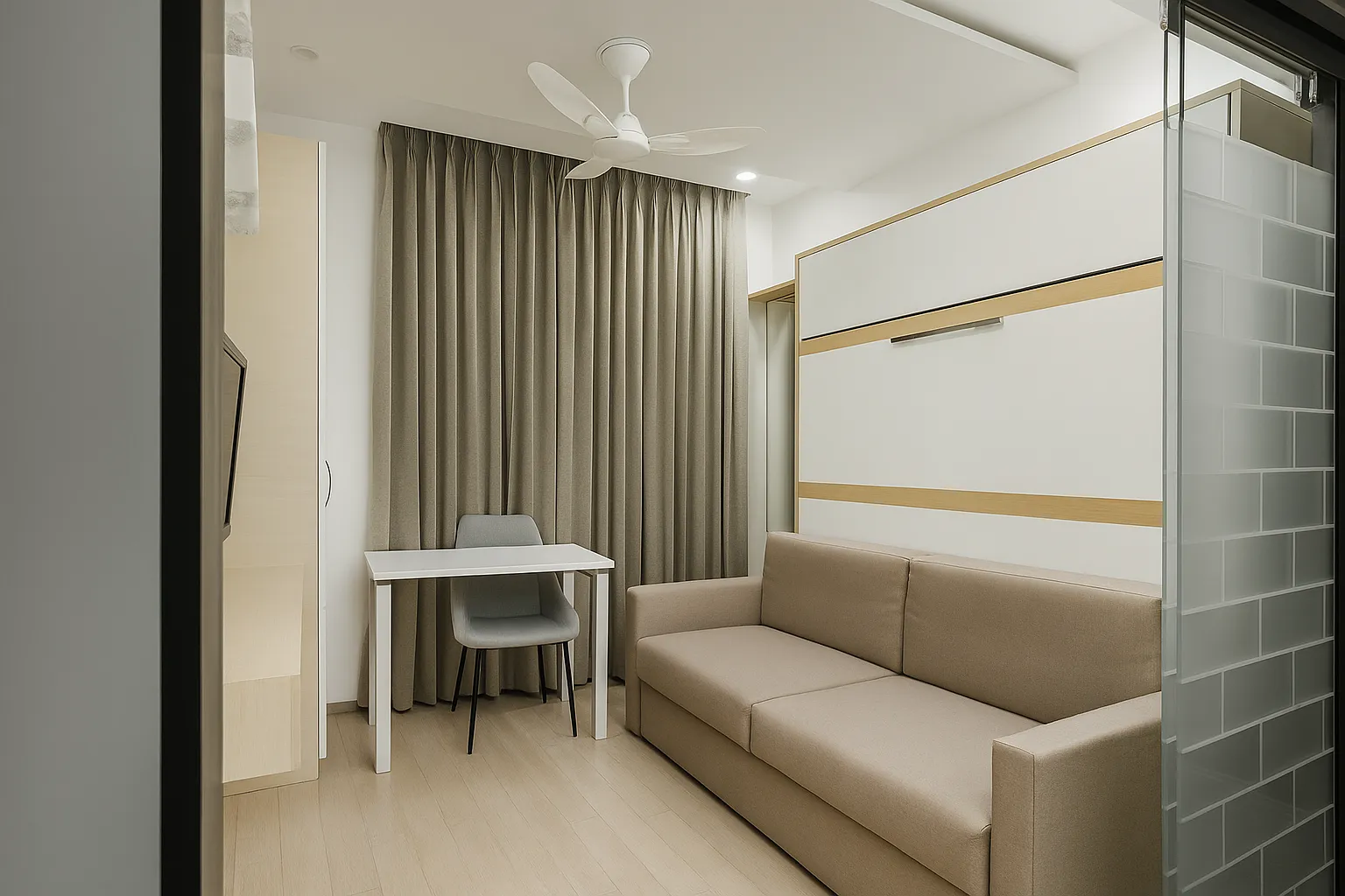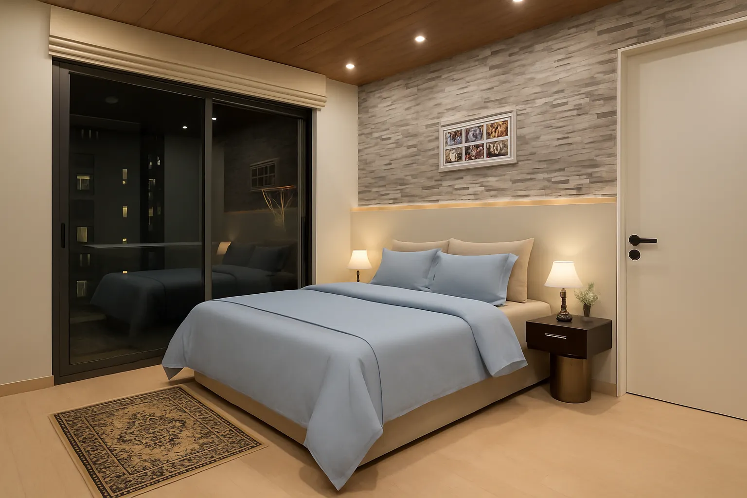 These Minimalist designed bedrooms with a warm wooden ceiling and floor, a textured stone accent wall, and a platform bed as the focal point. Soft cove lighting and recessed ceiling lights create a calm ambiance, while large sliding glass doors enhance openness.