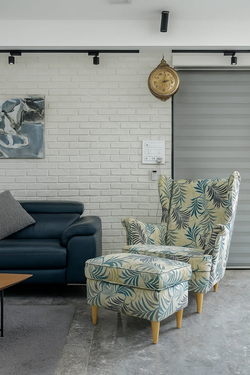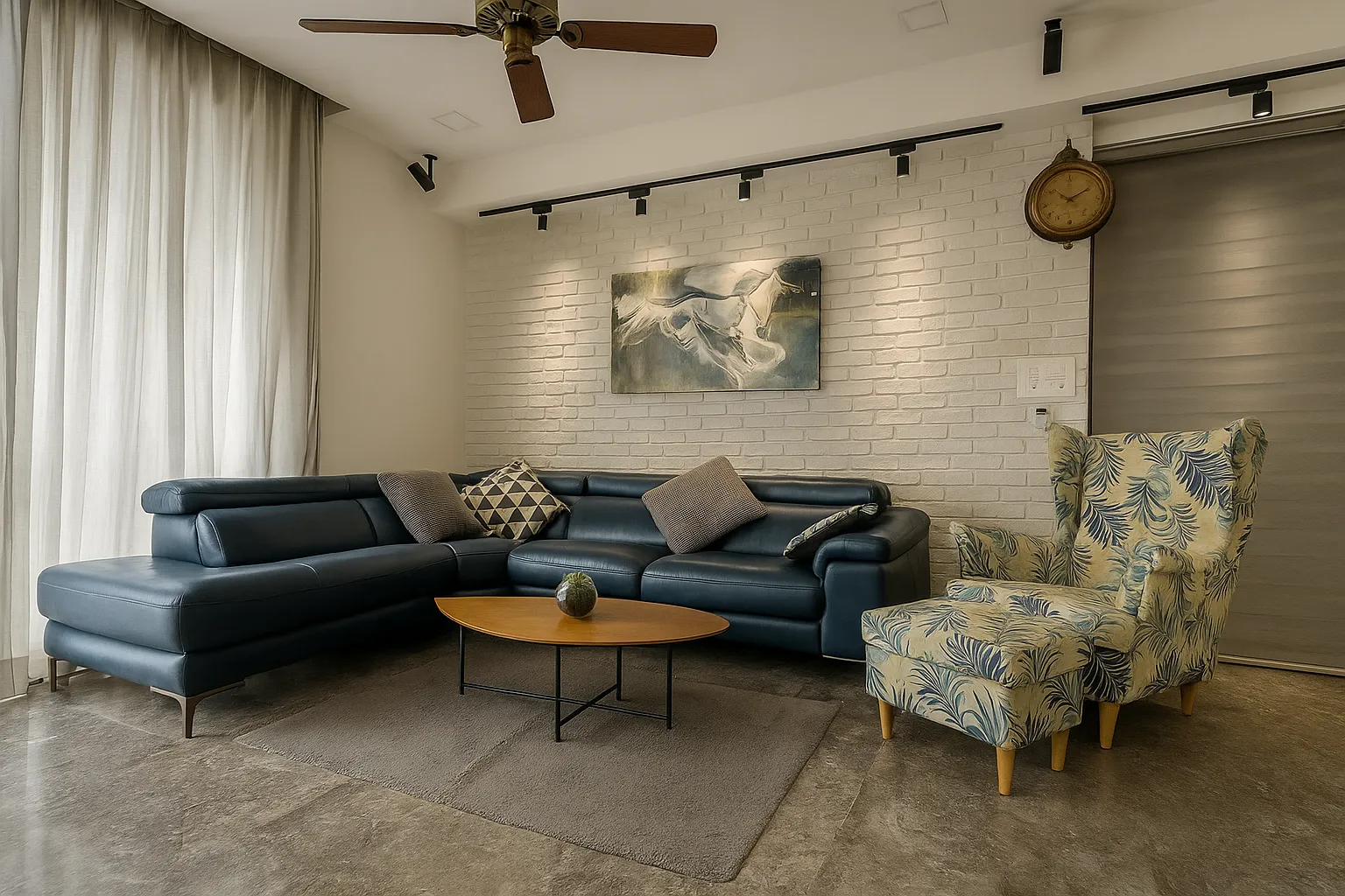 An industrial-style living room with an exposed brick feature wall, flexible track lighting, a warm wooden ceiling, and a soft shaggy rug. These elements balance raw texture with comfort, creating a modern and timelessly stylish space.