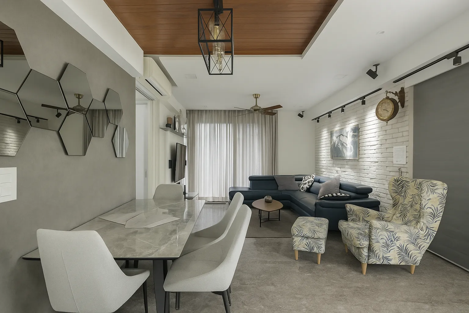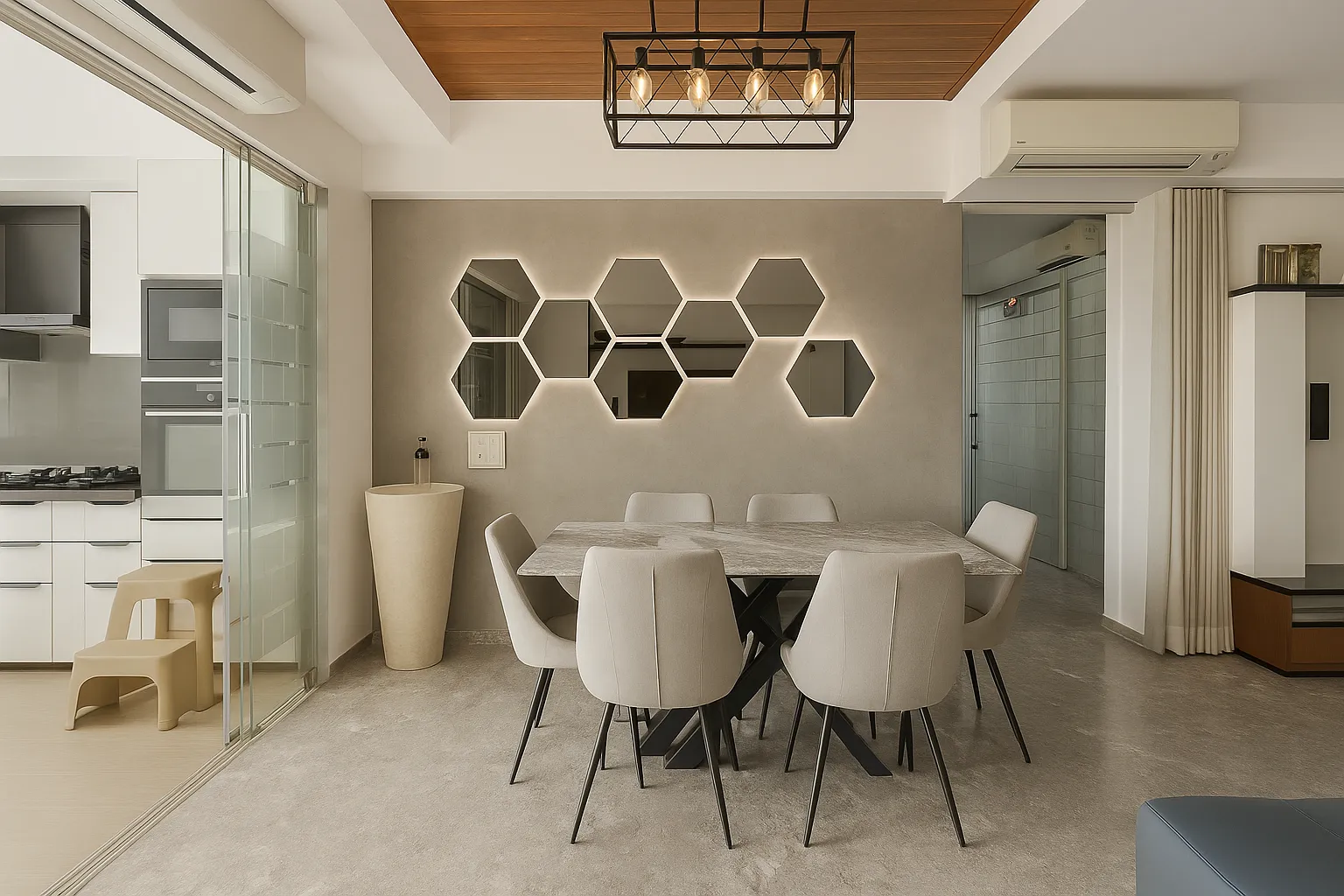This modern dining space features backlit hexagonal mirrors, a marble-top table with soft upholstered chairs, & warm wooden ceiling accent, creating a stylish and functional blend of elegance and comfort.