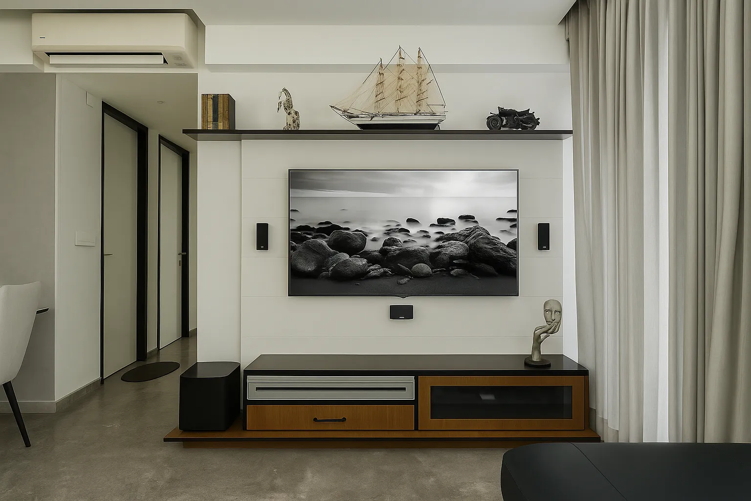 A sleek TV unit blends wood, black accents, and curated décor, creating a modern yet warm and elegant living space.