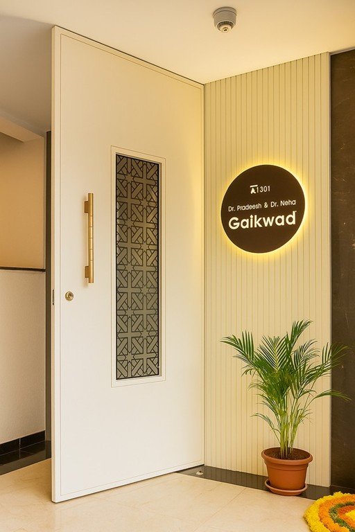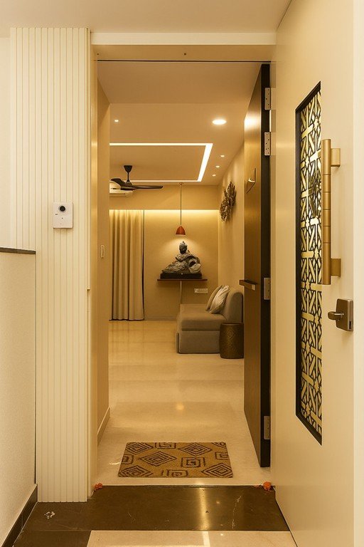 The entrance blends elegance and functionality, with a sleek white door featuring a geometric glass panel and adjacent grooved wall adding modern artistic detail.
