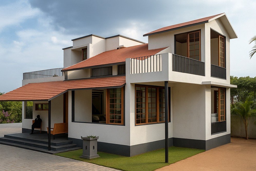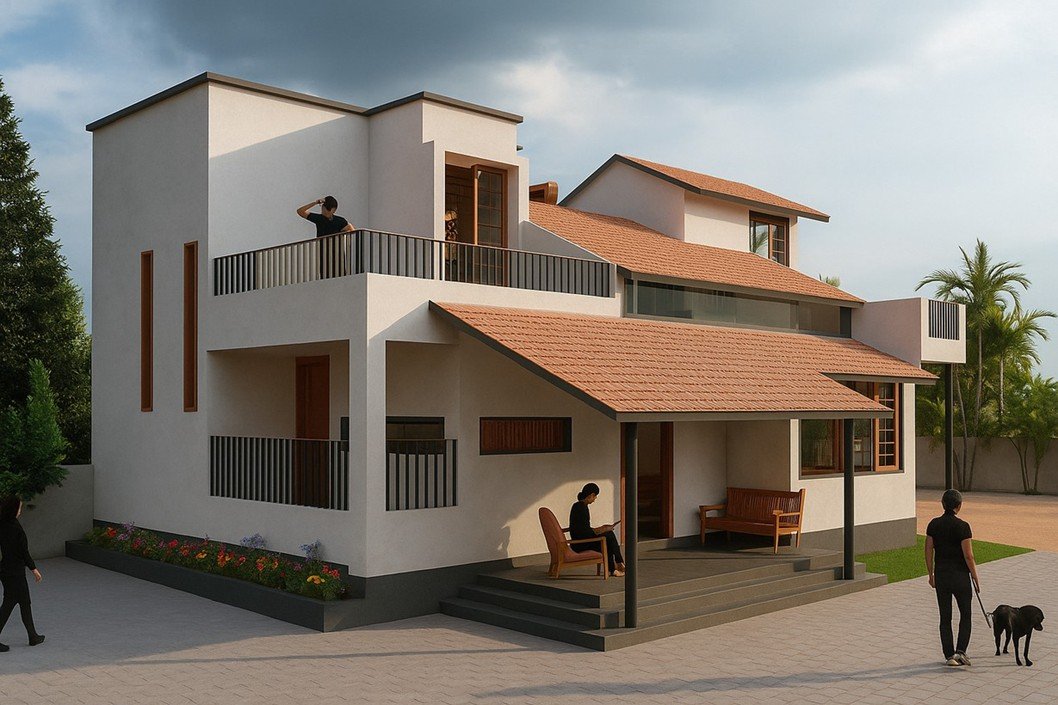 The structure is defined by twin sloping roofs that break into varying heights, lending rhythm and proportion to the façade. The kattaas (verandah seating spaces) act as key social nodes, fostering interaction while anchoring the home in tradition.