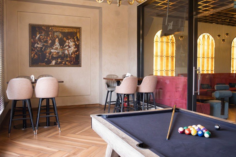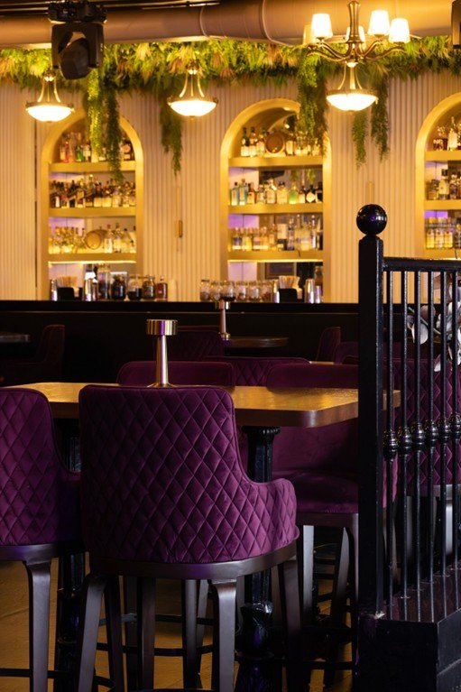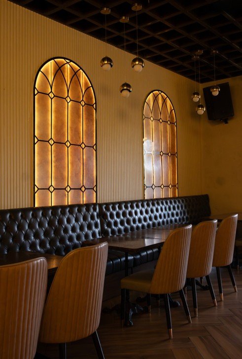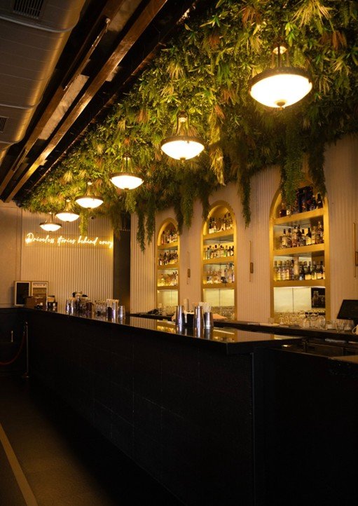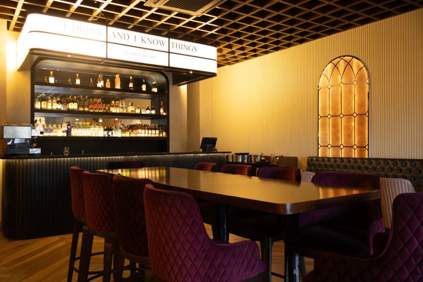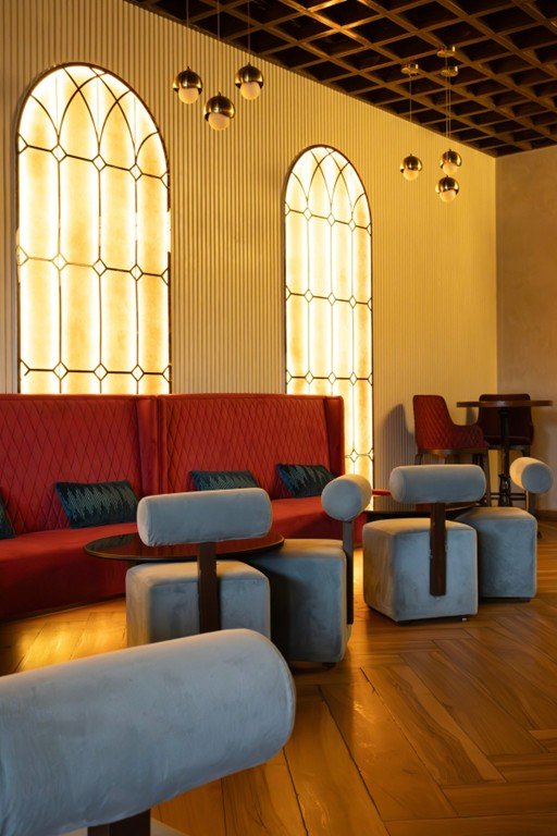Old Carrison Vintage Bar welcomes with grand arches, blending British elegance and Peaky Blinders–inspired vintage charm. Deep velvet tones, golden bar glows, arched cabinets, and curated paintings create a warm, intimate atmosphere. A landmark at NMMC’s dome, it offers every evening a timeless escape with a Peaky twist.