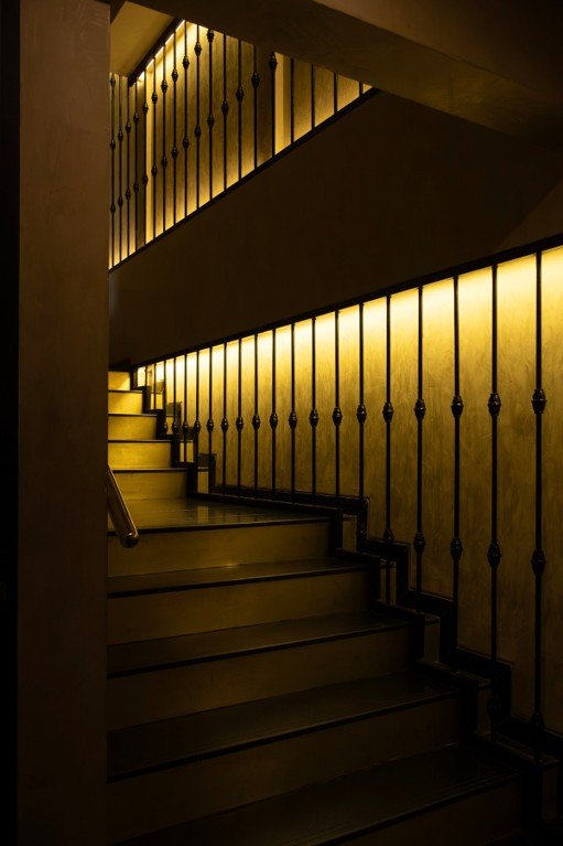Walking through the entire space feels like a calm journey, especially when the floors are coupled with that staircase defined by warm backlighting and clean vertical balusters, creating an elegant savvy.